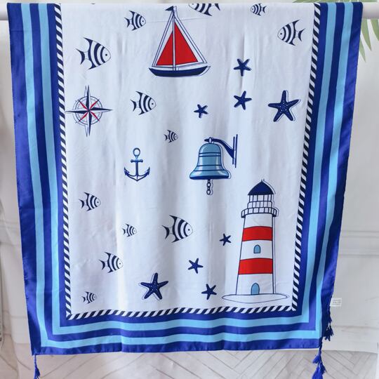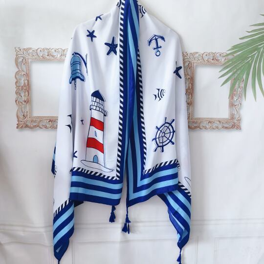 「エレガントな柄感と柔らかい素材が特徴のこのストールは、大人のコーディネートにぴったりのアイテムです☆ マリンモチーフのデザインは、ラダーや船のかじ、ヒトデを描いており、シンプルになりがちなコーディネートを優雅な雰囲気にアップデートしてくれます。季節感を感じながら、あなたのスタイルを華やかに演出してくれることでしょう。」