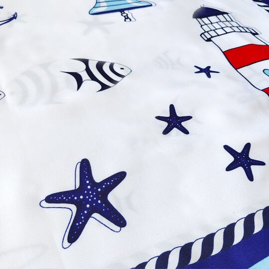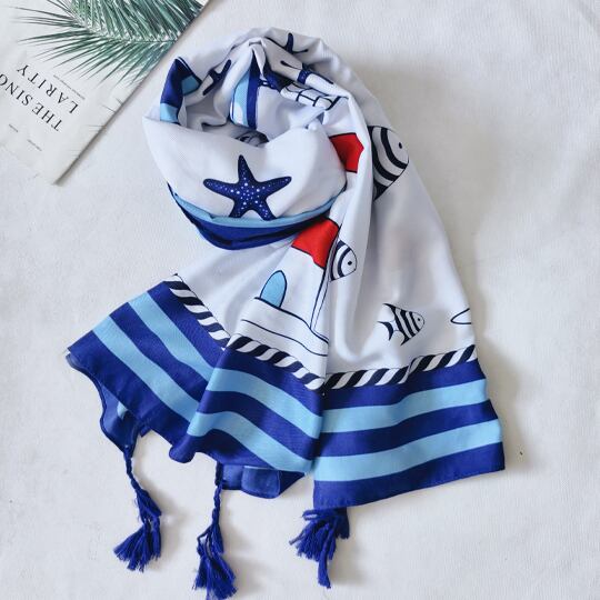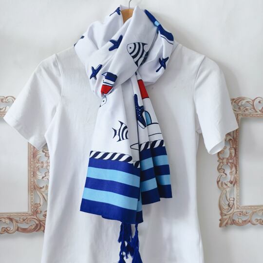 マリン柄がシーズンムードを盛り上げるストールです エレガントな柄感、柔らかい素材が大人のコーディネートにマッチします シンプルになりがちなコーディネートを優雅な雰囲気にアップデートしてくれる ラダー 船のかじ ヒトデ ma0020a