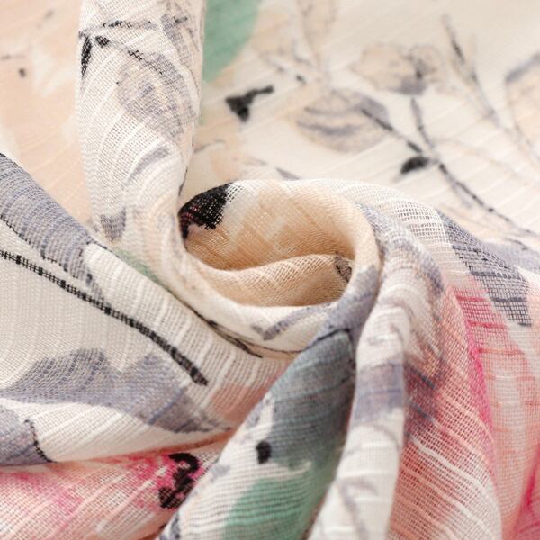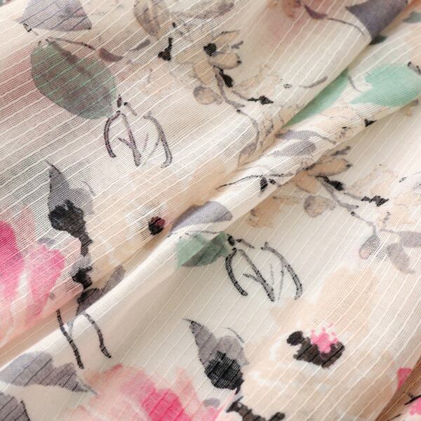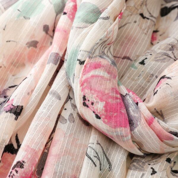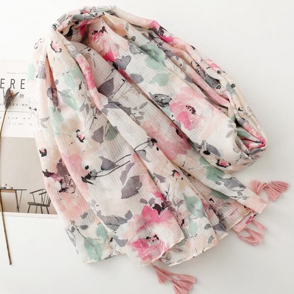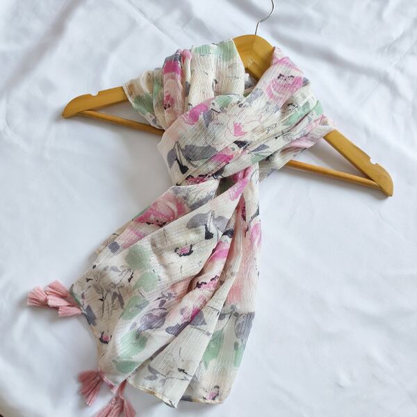春にぴったりの水彩フラワーテーマを基にしたデザインのスカーフ 墨絵風の大輪の花柄が描かれ、ピンクとグリーンの調和が優雅に配置され アーティスティックな雰囲気を演出 裾に施されたピンクのタッセルが全体を柔らかく引き締め シーンに応じて異なる表情を楽しめる薄手仕様 ma0412a