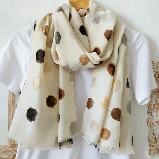 縁起柄・水玉 水彩画風ドットプリント 大判ストール ベージュ基調 暖色系 穏やか上品 秋冬コーデ 防寒対策 冷房対策 オフィス 通勤 ギフト プレゼント 母の日 クリスマス 冬ギフト ナチュラル 優雅 ma0366a