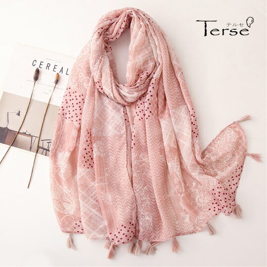 軽量なパッチワークプリントの薄ピンク大判ストール 軽くソフトな肌触りに仕上がっています ボリュームのある生地感が、首元に美しい立体感を演出 柔らかな風合いと使い勝手のよい大判サイズで、一年を通して身に着けていただけます 春夏 ma0205a