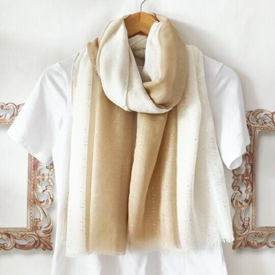 どんな装いにも自然に溶け込むベージュからホワイトへのグラデーションの大判ストール 金散らしとラメが施され、上品な輝きを放ちます 優しい配色は、肌に馴染みやすく、季節を問わず活躍します 特別な日にも、日常のアクセントにも最適なアイテム ma0402abe