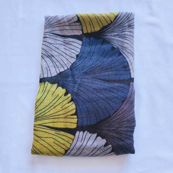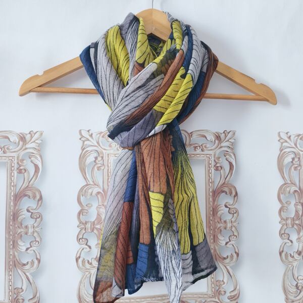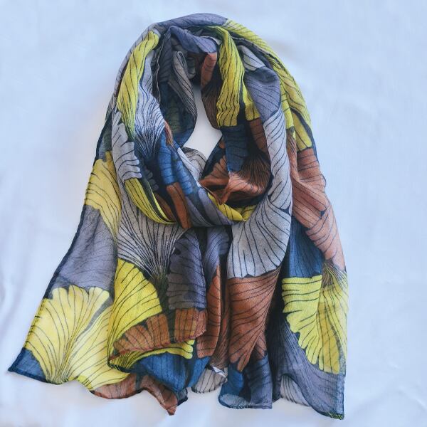 秋にぴったりのイチョウ葉テーマを基にしたデザインのスカーフ イエロー / ブラウン / ブルー / グレーの調和が鮮やかに描かれ、秋らしい豊かな雰囲気を演出 薄手のビスコース素材で肌触りが良く、シーンに応じて異なる表情を楽しめる ma0413aye