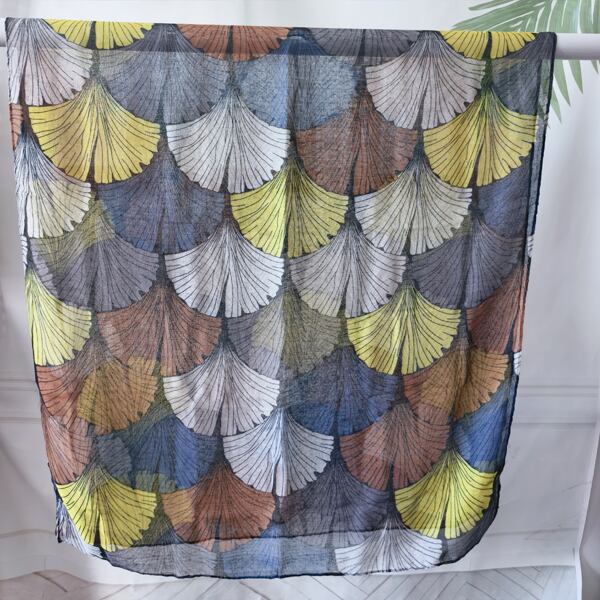「秋にぴったりのイチョウ葉テーマを基にしたデザインのスカーフ」は、イエロー、ブラウン、ブルー、グレーが調和し、豊かな秋の雰囲気を演出します!美しいイチョウ葉のモチーフは、シンプルなコーディネートに華やかさを加え、季節感を楽しむことができます。薄手のビスコース素材は肌触りが良く、軽快な使い心地が魅力的です。