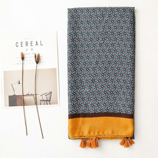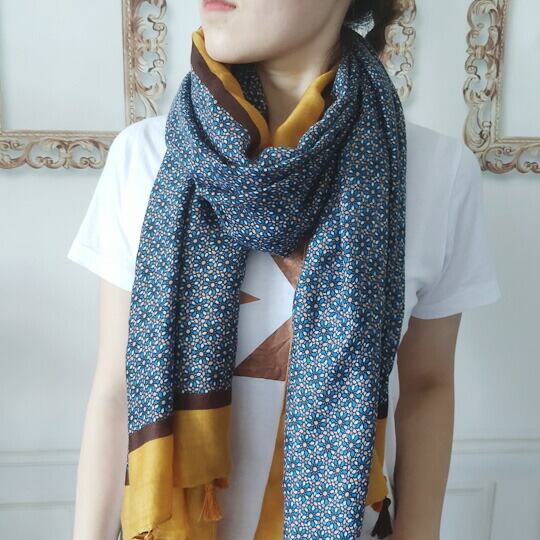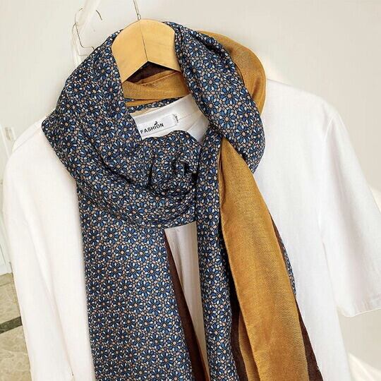 グラフィカルなプリントが都会的でマチュアな印象を与えてくれるプリント ストール 首に巻いたり肩から羽織ったりとワードローブのアクセントにもなり、洗練された雰囲気に ジャケットなどのオンスタイルから、カジュアルでシンプルな装いまで幅広く合わせるデザイン