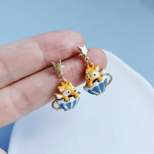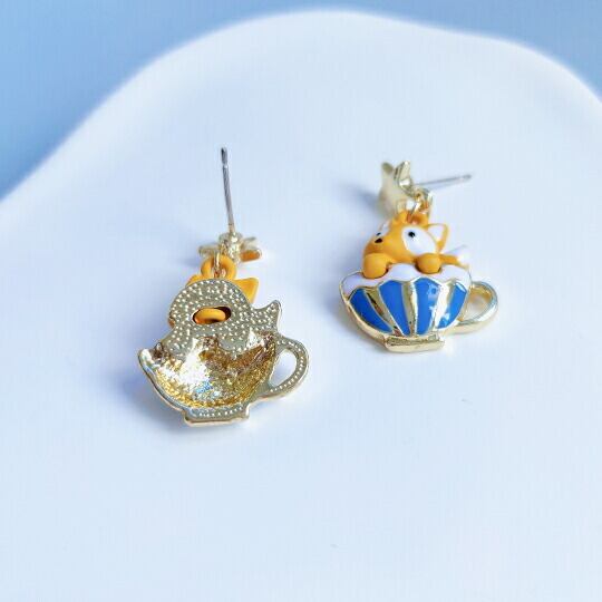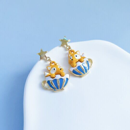 ■遊び心あふれるデザイン!Terse コーヒーカップの中に可愛いきつねがちょこんと座っているピアス☆