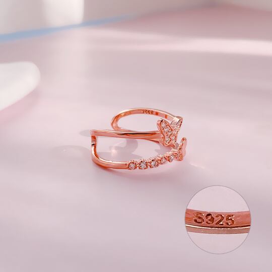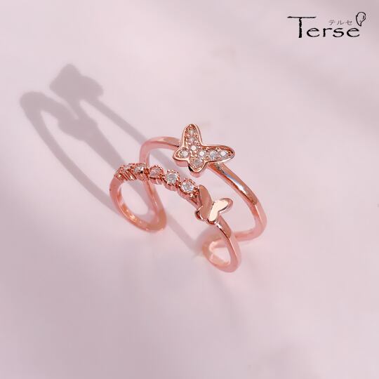 Terse上質CZダイヤがセットされた蝶型2連セットリング 中央の指輪が蝶をモチーフしたハイセンスなデザインでそれを挟み込むようにシンプルなフォークリングがセットでき ゴージャス感を一層アピールします 高貴な輝きにきっと目を奪われる サイズフリーrs0211apg