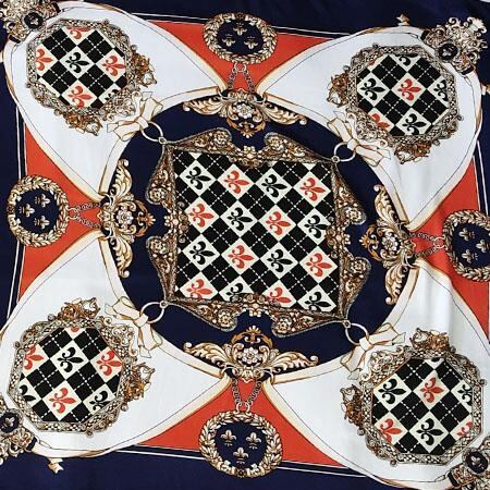 大判 フルール・ド・リス ヨーロッパの紋章 模様 シルクタッチツイルのストール 全体にネイビー、オレンジ、ホワイトのグラフィック 歴史的、神秘的なテーマ 冷房対策 UVカット 日焼け止め ma0098ana