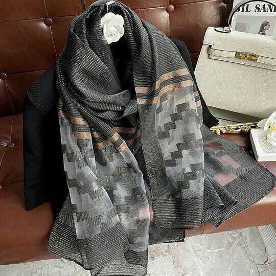 この「薄手大判ストール」は、ブラックにはないニュアンスを演出し、シックで大人っぽいコーディネートに最適です!透け感のある部分とない部分が絶妙に絡み合い、どんな装いにも洗練された印象を与え、存在感を放ちます。