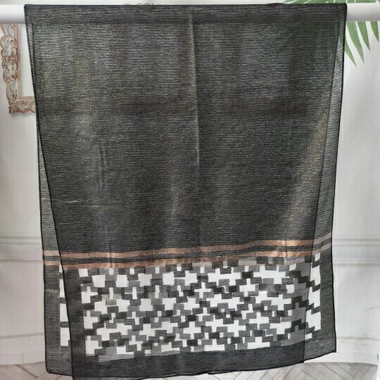 透け感のある素材と透け感のない素材を巧みに組み合わせた薄手大判ストール 幾何学模様が施され、落ち着きのあるダークグレーがさりげなくフェミニンな印象を与え 黒にはないニュアンスを演出し、シックで大人っぽいコーディネートに最適です ma0401abk