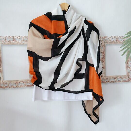 鮮やかなオレンジとベージュの色合いが目を引く大判ストール 幾何学模様が施されたこのアイテムは、シンプルながらも洗練されたデザインが特徴で、どんな服装にも簡単に合わせ 白いTシャツに巻かれたこのスカーフは、カジュアルな装いに華やかさをプラスma0352aor