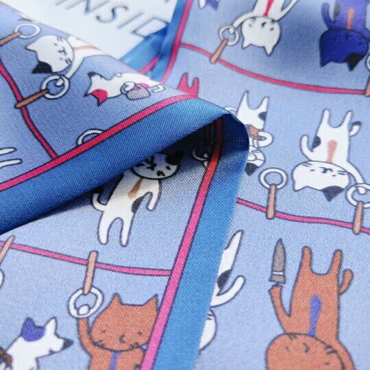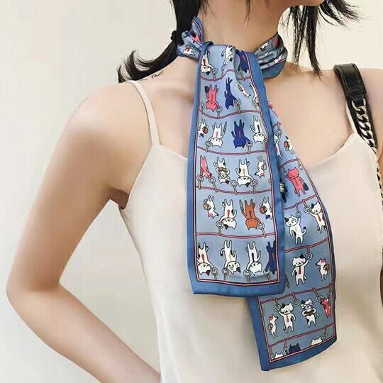 個性的なコーディネートを楽しむ!前で差し込むタイプの「簡単なネコモチーフスカーフ」は、かわいらしい猫柄が特徴です♪遊び心たっぷりで、おしゃれを気軽に楽しめるアイテムです!洋服やバッグのアクセントとしてはもちろん、ヘアアレンジにも最適。キュッと結ぶだけで手軽にアレンジができ、様々なスタイルに合わせやすいのが嬉しいポイントです☆