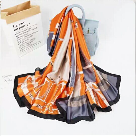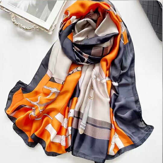 ベルト×チェーン アクセントデザイン 大判ストール オレンジ×グレー コントラスト エレガント 秋コーデ シンプルに華やか 日常を格上げ おしゃれ 秋冬 おでかけ オフィス 通勤 ギフト プレゼント レディース ストール スカーフ ma0351a