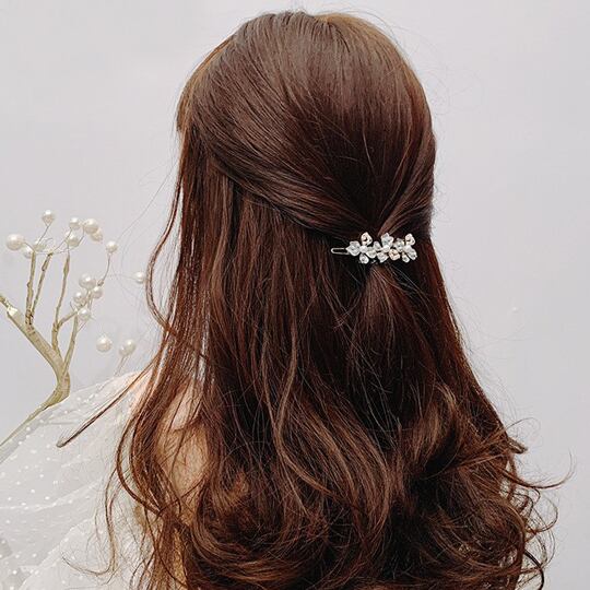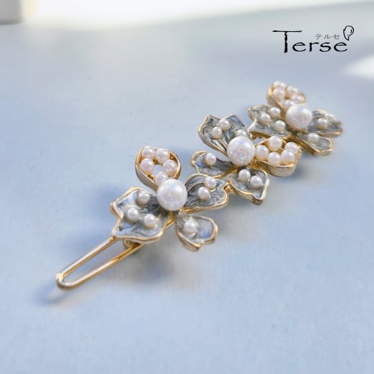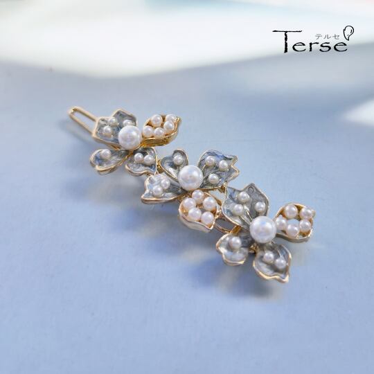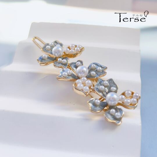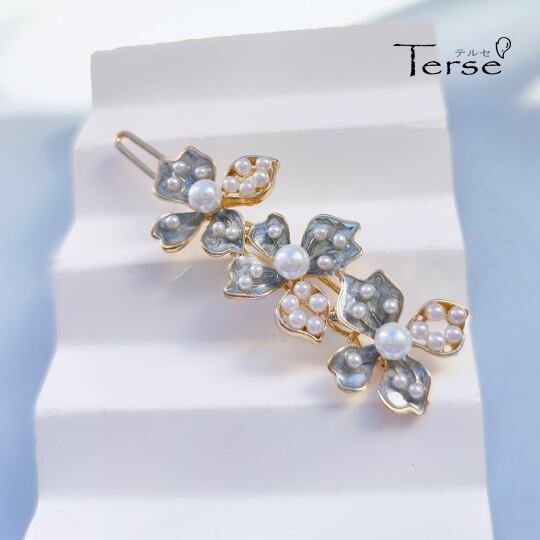 Terseベビーパールと花モチーフが美しく調和し、髪をまとめる際に優雅な印象を与えエナメル質の上品なグレー色が特徴のヘアピン 日常の装いに洗練されたアクセントを加え シンプルながらも華やかさを持ち合わせており、特別な日にも普段使いにも適しています ha0175a