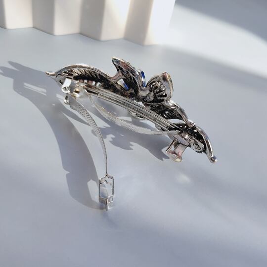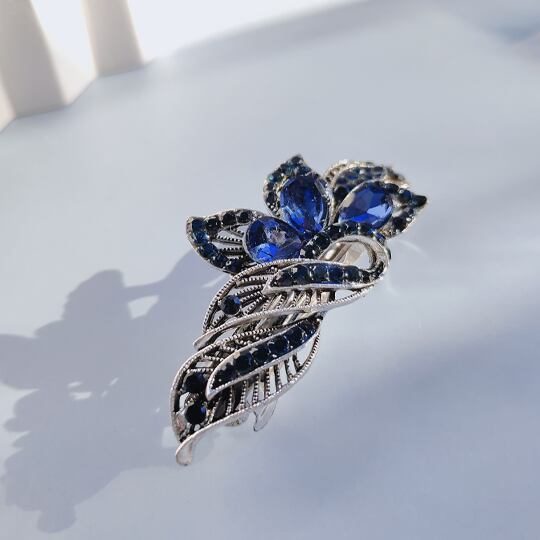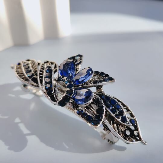 Leafyアンティークな魅力を放つ透かし細工とネイビー色石のバレッタ 繊細なデザインが施された透かし模様は、光を受けるたびに美しい輝きを放ち、装いに上品なアクセントを加え 存在感と神秘性を兼ね備え 特別な日の装いに、また日常のスタイルに個性を添え ha0169ana