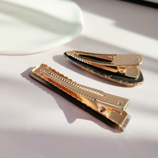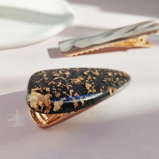 Terse上品で落ち着いた輝きを放つ金箔が特徴のアクリルヘアアクセサリー 派手すぎず、控えめな輝きが大人の女性にぴったり 黒をベースにしたデザインは、金箔の美しさを一層引き立て、凛とした華やかさを演出 高見えするデザインで、目立つこと間違いなし ha0167abk