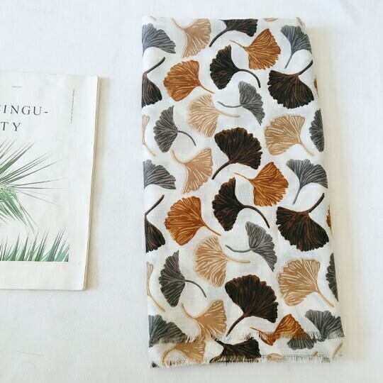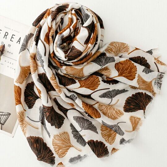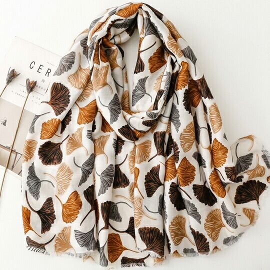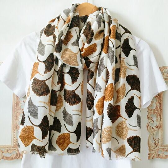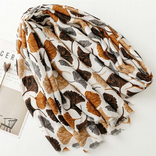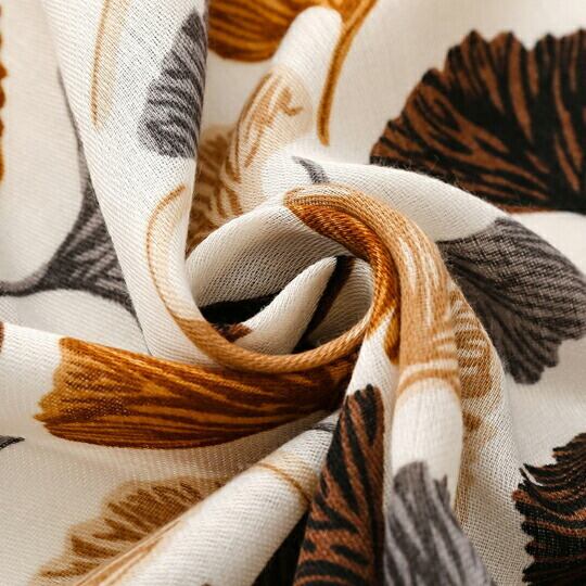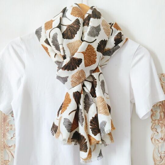 銀杏の葉が美しくデザインされたストール 暖色系の色合いが白地に映え、上品でお洒落な印象を与え 秋の装いにぴったりのアイテムで、どんなスタイルにも自然に溶け込み 軽やかな素材感が心地よく 幅広く活躍 季節感を取り入れたファッションを楽しみ ma0361abe