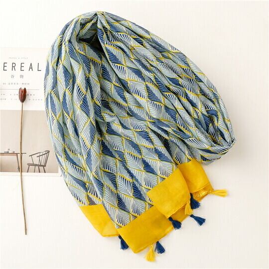 幾何学的な葉の抽象的なプリントストール ライトブルーに爽やかなイエローがポイントに シンプルながら上品で大人な印象 シワになりにくい素材なのでバッグの中に入れて持ち運ぶことも可能で、夏のエアコン対策としても使用でき ma0264a