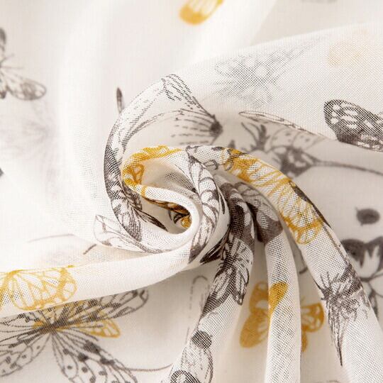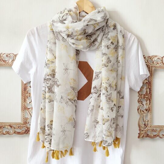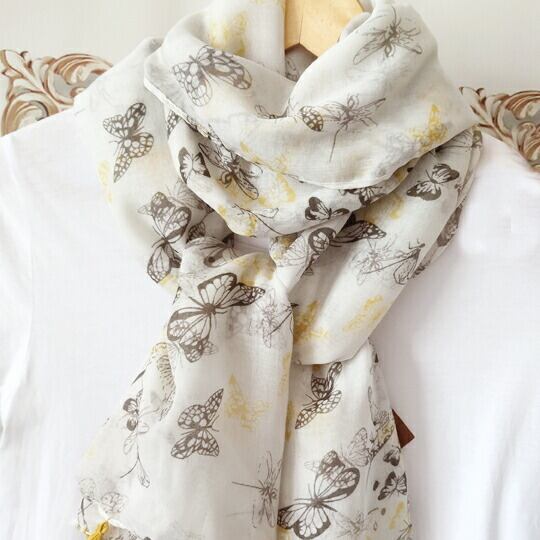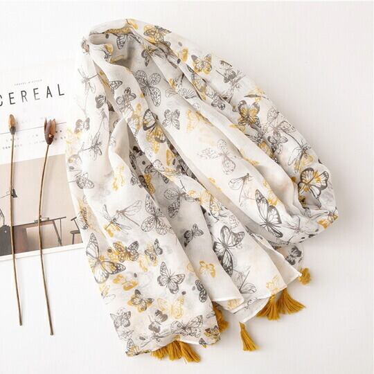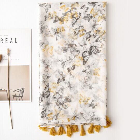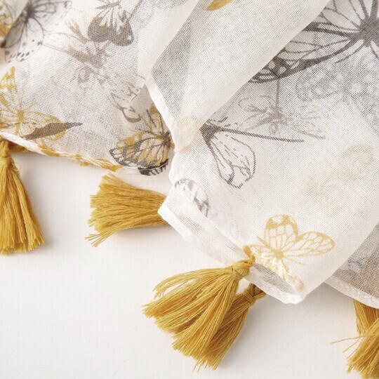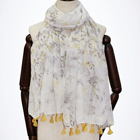 フェミニン蝶ちょストール 白地にプリントフリンジショール 首元にさらりと垂らしたり、ラフに巻いたりとアレンジしやすい長方形で、シンプルな装いもこれ一枚でぐんと洗練 柔らかい素材ではの上品な光沢とエレガントな柄が、お顔周りを明るく彩ります 春 ma0185a